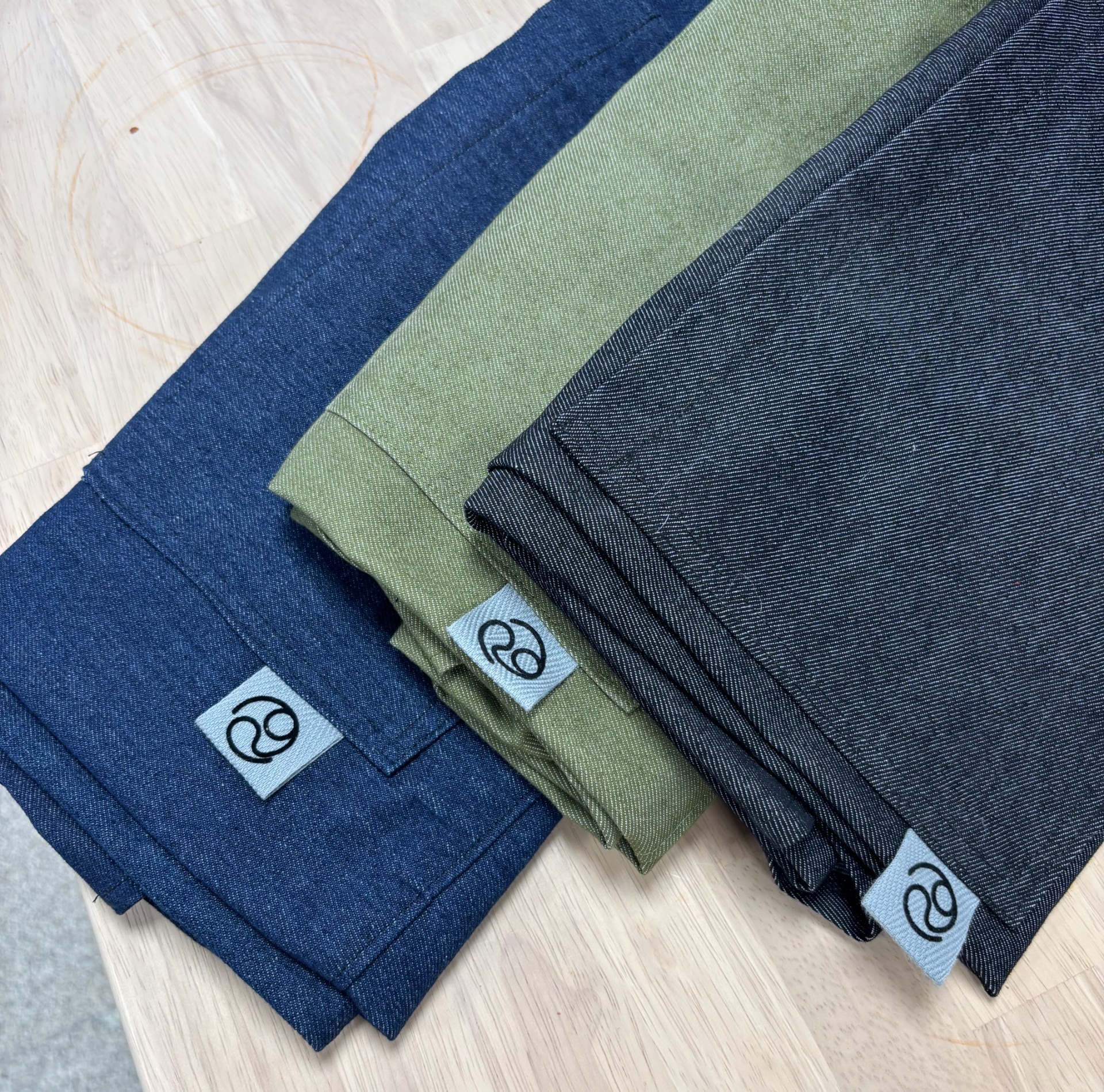 Als je met een gewone keukenschort aan de draaitafel zit, zijn je benen slechts gedeeltelijk bedekt. Bij deze 'draaischort' is het onderste deel in 2 stukken gemaakt, die vanzelf openvallen over je benen als je aan de draaitafel plaatsneemt. De stof in jeans is soepel maar toch dik genoeg, zodat ze voldoende vocht kan absorberen. En vooral : kreukt nauwelijks zodat je niet moet strijken... en meer draai-tijd hebt ;)